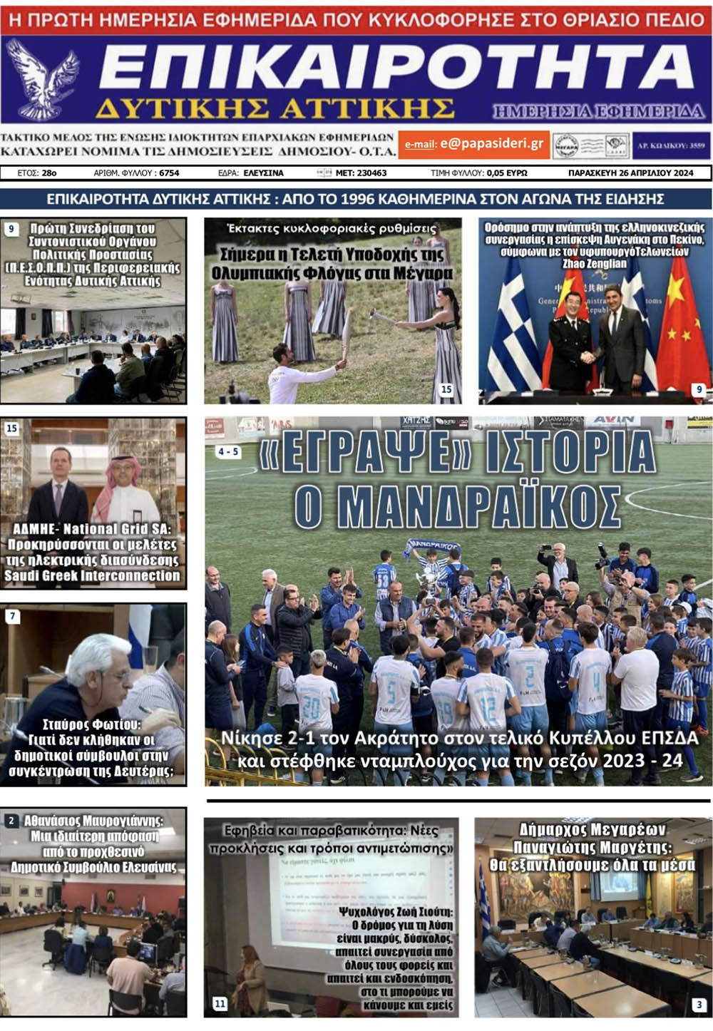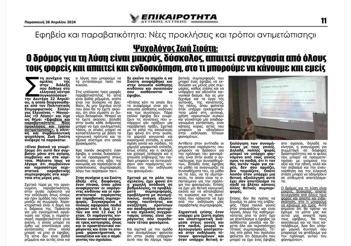 .Αφιέρωμα στην εφημερίδα Επικαιρότητα Δυτικής Αττικής και στο τεύχος με Αρ. Φύλλου: 6754 της 26/04/2024 για την ομιλία με θέμα: «Εφηβεία και Παραβατικότητα: Νέες Προκλήσεις και Τρόποι Αντιμετώπισης» που έλαβε χώρα στις 22/04/2024 στο Αμφιθέατρο του Ελληνικού Ινστιτούτου Συγκολλήσεων υπό την αιγίδα του Πολτιτιστικού Επιμορφωτικού Συλλόγου Ελευσίνας – Μαγούλας «Ο ΛΟΓΟΣ».